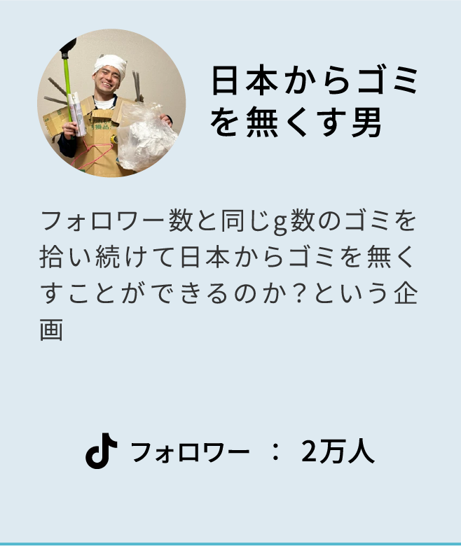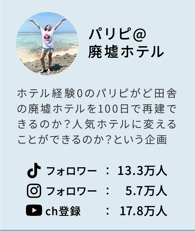 SNSの力だけで倒産寸前のリゾートホテルを奇跡の再建させた後、「パリピ廃墟ホテル」「毎日100gずつ痩せるデブ」「全く新しい高校を作る男/為国」「日本からゴミを無くす男」など、業界の常識を覆す40以上のバズアカウントを次々と量産。その異端的な発想力と企画力は、メディアからも熱視線。
